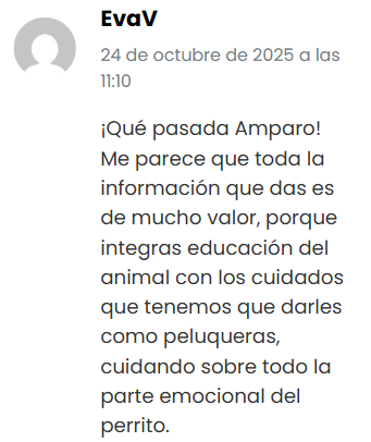 Con esta visión, creé el “Método RESHA” (Reducción Empática de la Sensibilidad a la Higiene en Animales), una metodología que transforma el cuidado de los perros en una experiencia respetuosa y enriquecedora, que ya ha ayudado a muchas familias y profesionales del sector.