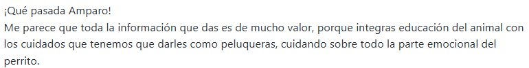En 2014 empecé en el sector como Auxiliar Veterinaria, pero fue la Peluquería Canina la que despertó una pasión que sigue creciendo.