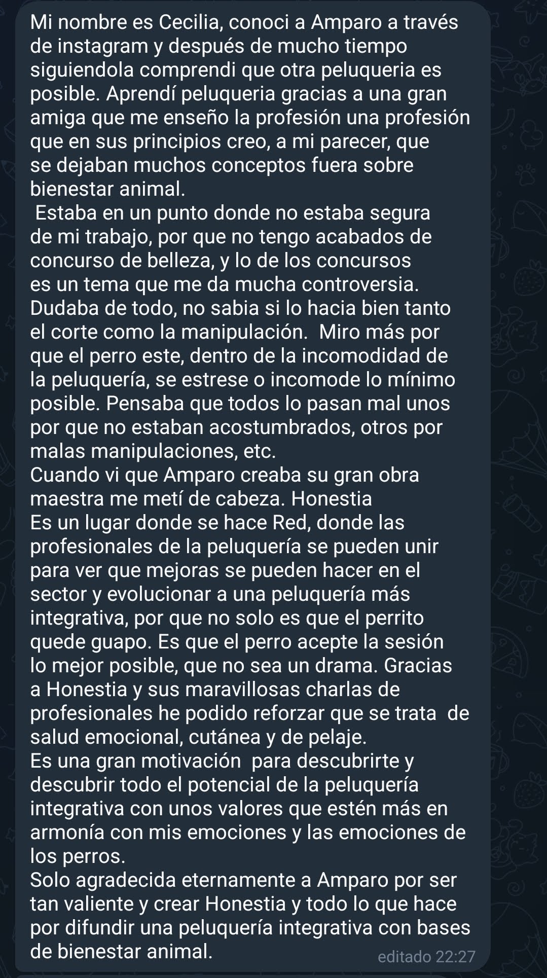 Hoy, mi objetivo es ayudar a evolucionar la peluquería canina como la conocemos y aumentar el bienestar integral de los perros. Y, ya que estamos entre confesiones, amo la naturaleza, la espiritualidad y viajar.